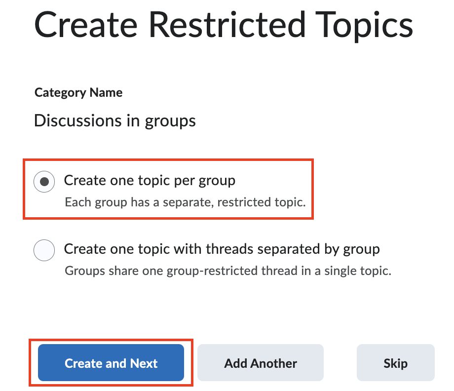 8. Check the radio button for Create one topic per group and then, click Create and Next.
