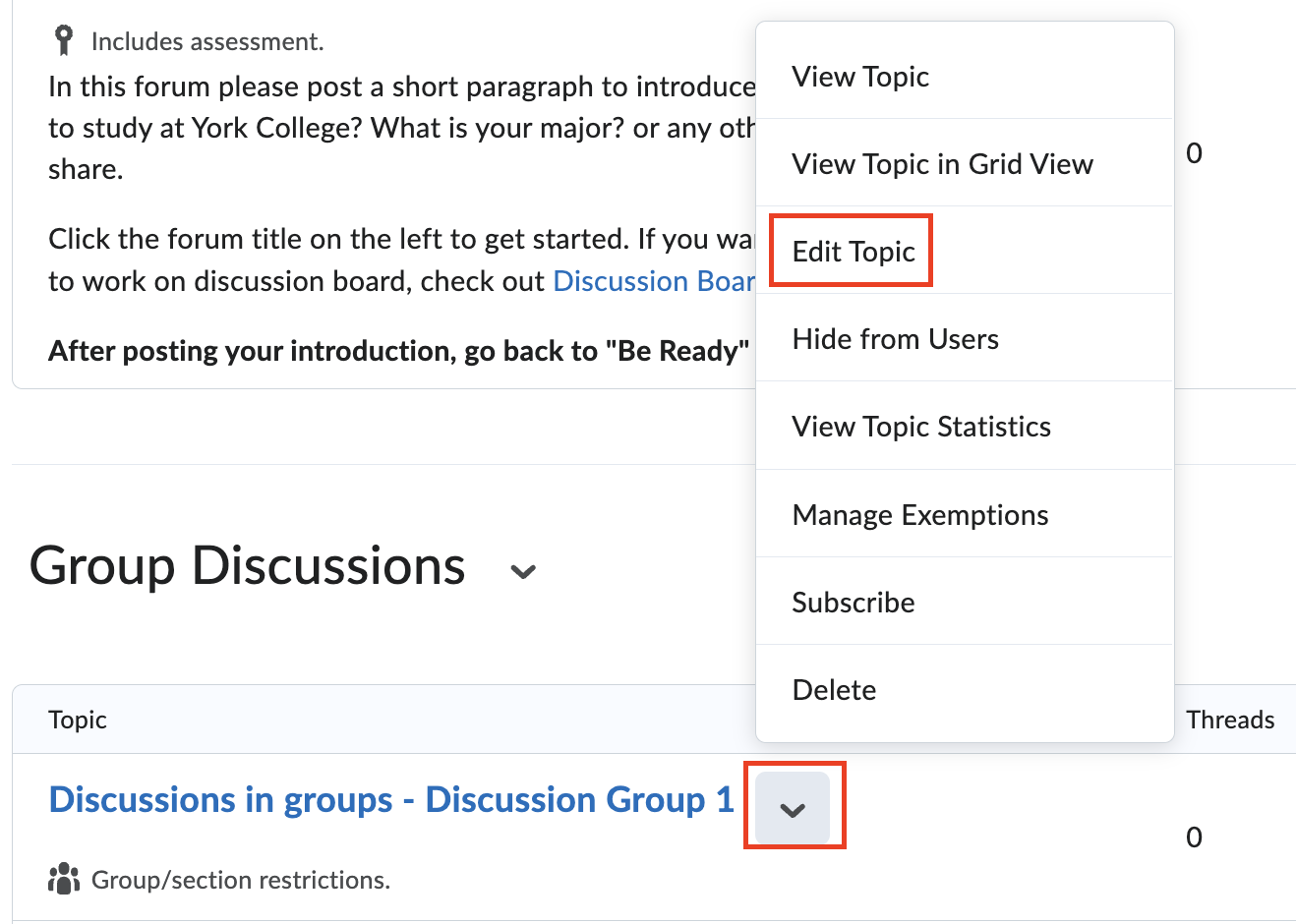 11. Click the down arrow next to a group topic and select Edit Topic.
