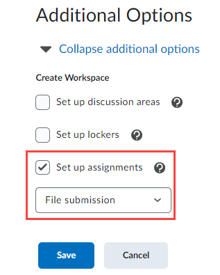 1. In your category and group setup page, under "Additional Options," check the box for "Set up assignments" and select "File submission" in the dropdown box if you want to collect assignment files in the course site. Click Save.