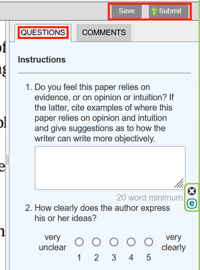 - If you see instructions on the Questions tab on the right panel, use the questions to guide your review and provide your answers after reviewing the paper. If you are not ready to submit, click the Save button on the top right. You can always come back to add and/or revise your answers before the due date. After you complete the review and answer all questions, click the Submit botton on the top right.