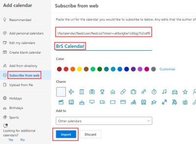 8. On the pop-up widow, click Subscribe from web. Then paste the calendar URL you just copied from your Brightspace (BrS) calendar to the URL field. Type in a name for the calendar. Click the Import button at the bottom.
