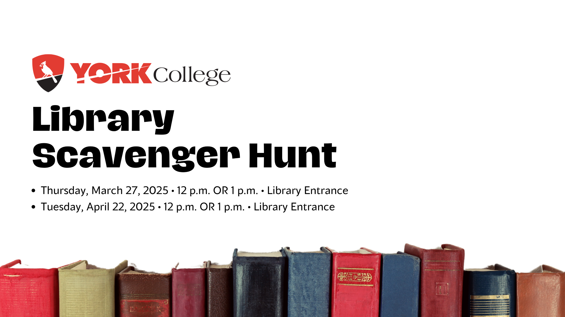 Have you explored the York College Library yet? Have you used the Library printer but wonder what other useful things are in there? Join us for a fun adventure and learn some information literacy and library research skills at the same time! Put together your own team of up to 10 people or come on your own and make some new friends! The scavenger hunt is an hour. Choose to start at 12 p.m. or 1 p.m.